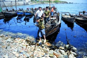 7月18日,漁船停靠在被石油污染的海岸邊。本版攝影/本報記者 李強