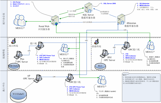 1、數據采集:海上平臺、南山終端、香港氣體接收終端三個站點分別部署接口機。海上平臺接口機通過GE iFIX Power Tool與Emerson Detal V的OPC Server通訊,實現從海上平臺中控系統的數據采集。接口機上安裝GE Historian OPC Collector,將采集數據從iFIX Power Tool中獲取上來,并將數據傳送到GE Historian;海南南山終端接口機通過GE iFIX Power Tool與Emerson Detal V的OPC Server通訊,實現與南山終端中控系統的數據采集。部署在接口機上的GE Historian OPC Collector從iFIX Power Tool中獲取數據,并將數據傳送到GE Historian中。香港氣體接收終端的中控系統是Emerson RS3(Rosemount)(以下簡稱RS3),RS3不支持OPC Server,通過對老系統RS3升級,利用RS3 RNI OPC Server將RS3的自動化數據轉換為OPC標準的數據對外發布,接口機通過GE iFIX Power Tool和RS3 RNI OPC OPC Server通訊,實現自動化數據的采集,并通過GE Historian OPC Collector將數據傳送到GE Proficy Historian。