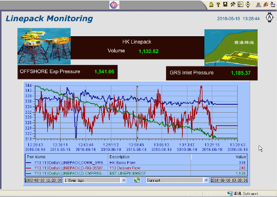 5、數據展現:該系統使用了GE Proficy的RTIP產品,實現了實時數據和歷史數據的可視化展現與分析。見下圖: