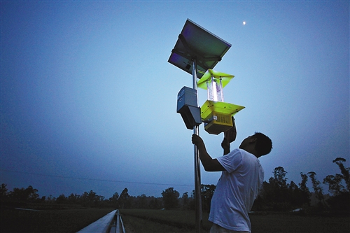 6月17日傍晚,大足區(qū)龍崗街道明星村3組的稻田間,工作人員正在調(diào)試新安裝的頻振式太陽能殺蟲燈。這種殺蟲燈可誘殺螟蟲、稻飛虱、稻苞蟲等10余種水稻害蟲,減少農(nóng)藥用量;同時,還具有光照和濕度雙重智能化控制功能,可實(shí)現(xiàn)晴天夜間自動開啟,白天和雨天自動關(guān)閉。當(dāng)前正是水稻拔節(jié)孕穗期,由于入夏后病蟲害增多,水稻病蟲害防治進(jìn)入關(guān)鍵時期,該街道已安裝200余盞頻振式太陽能殺蟲燈,殺蟲面積達(dá)5000余畝。