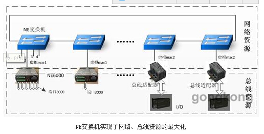 NE交換機支持多種總線協議及I/O接口,實現總線數據的網絡化。代替非傳統的點對點模式,使網絡和總線的資源利用率最大化。進而實現靈活的網絡配置,可直接連接儀表、工業相機等現場設備,讓PLC能夠連接到距離更遠的I/O設備,大大減少整個系統內PLC的數量,顯著的降低了系統集成的成本。此外NE交換機還可通過Web和SNMP OPC Server集成到網絡監控軟件實時監控節點狀態,并設有故障警報功能,方便遠程維護和管理。