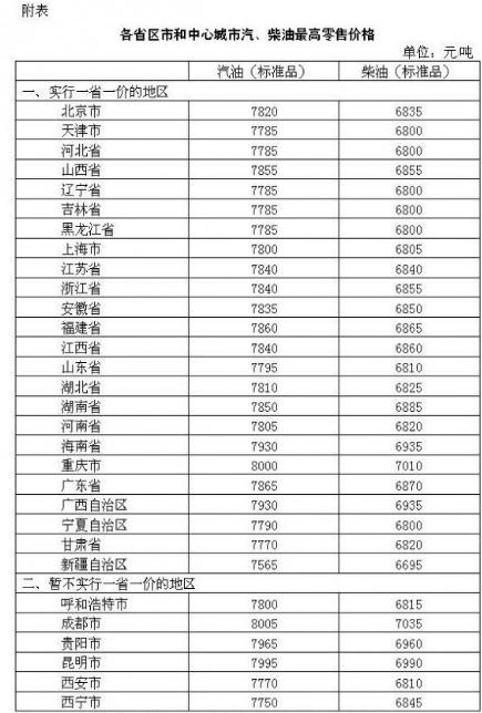 附:各省區市和中心城市汽、柴油最高零售價格