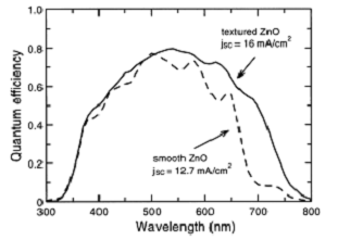 圖2 在光滑與織構的AZO表面上沉積a-Si電池獲得的量子效率比較