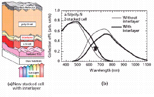 圖8 左圖:具有透明中間層的a-Si/mc-Si疊層電池的結構示意圖,右圖:有中間層與沒有中間層的a-Si/mc-Si疊層電池的量子效率對比