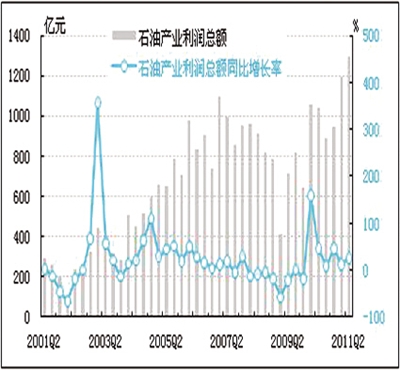 經初步季節調整,2011年二季度石油產業利潤總額為1300.5億元,同比上升25.2%,同比增速較上季度加快12.9個百分點;環比增長9.1%,增幅較上季度收窄16.8個百分點。