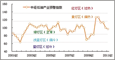 2011年二季度,中經石油產業景氣指數為99.5點,較上季度微升0.2點;中經石油產業預警指數為96.7點,較上季度回落3.3點,目前處于“綠燈區”中心線以下。