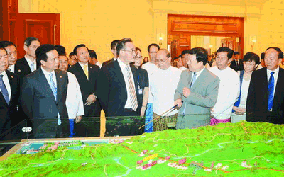 吳邦國了解到在中緬油氣管道項目建設過程中,中國石油大力開展公益事業,有效帶動當地企業發展,積極推進當地勞動就業,培養當地管道專業人才,改善管道沿線教育醫療條件,取得了顯著成效。他充分肯定了中國石油的工作,并興致勃勃地向吳登盛介紹中緬油氣管道工程對改善民生、惠及多方和帶動兩國經濟發展的重要意義。吳登盛頻頻點頭表示贊同。