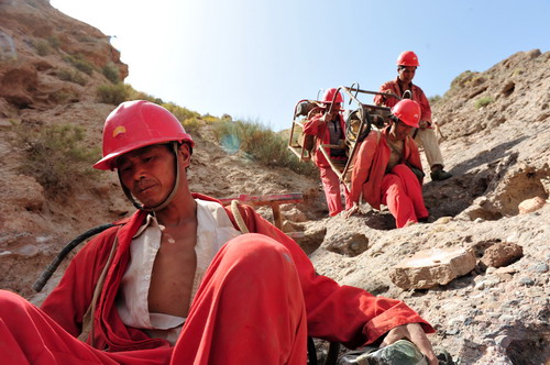 圖為施工隊(duì)伍在昆侖山上搬遷鉆機(jī)