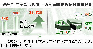 4個氣源同時運行,使“西氣”資源出現了跨越式增長。2009年,“西氣”的供應量為199億立方米,2010年為245億立方米,2011年為360億立方米。資源增長一年上一個大臺階。