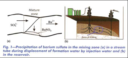 對(duì)于生產(chǎn)井的地層損害而言,硫酸鋇沉淀是其主要物理機(jī)理。通常海上油田注水水源是海水,海水中富含陰離子。如果地層水包含陽離子,經(jīng)混合注入后,地層水會(huì)出現(xiàn)硫酸鋇沉淀(見圖1)。同樣反應(yīng)發(fā)生于硫酸鹽陰離子和鍶、鈣或其它金屬陽離子之間。地層水與海水的混合區(qū)域內(nèi)易發(fā)生硫酸鹽沉淀。注水時(shí)在注水井到生產(chǎn)井井底地間之間所形成的混合區(qū)域持續(xù)向生產(chǎn)井方向移動(dòng)(即當(dāng)混合區(qū)域經(jīng)過井網(wǎng)時(shí),其在很短時(shí)間內(nèi)會(huì)在油藏井網(wǎng)內(nèi)形成聚集(Fig.1b)。混合區(qū)域移動(dòng)所形成的沉淀就地層孔隙空間而言,僅占一小部分,并不能降低地層滲透率。地層水/海水持續(xù)混流至生產(chǎn)井區(qū)域,而生產(chǎn)井所產(chǎn)出液中包括來自高滲透地層的注入水和來自