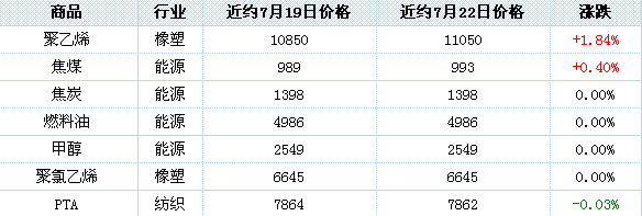 據(jù)生意社價格監(jiān)測,2013年7月22日能源石化期貨近約榜中上漲的商品共2種,下跌的商品共1種,漲跌為0的商品共4種上漲的主要商品有:聚乙烯1.84%、焦煤0.40%;下跌的主要商品有:PTA-0.03%。