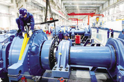 12月5日,新疆哈密海裝風電制造基地員工在組裝風電機組。