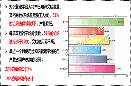 知識管理的重要性無需多言,但很多管理者認為這是一件“不可能完成的任務(wù)”。也的確有不少“慘烈”的例子,剛開始時轟轟烈烈,逐漸偃旗息鼓,最后費時費力上馬的知識管理系統(tǒng),只做員工閑來翻翻之用。KM CENTER經(jīng)過調(diào)研后,在其《中國知識管理現(xiàn)狀、問題和趨勢:2012中國知識管理實施調(diào)研結(jié)果分析》中給出了右圖的一組數(shù)據(jù)。
