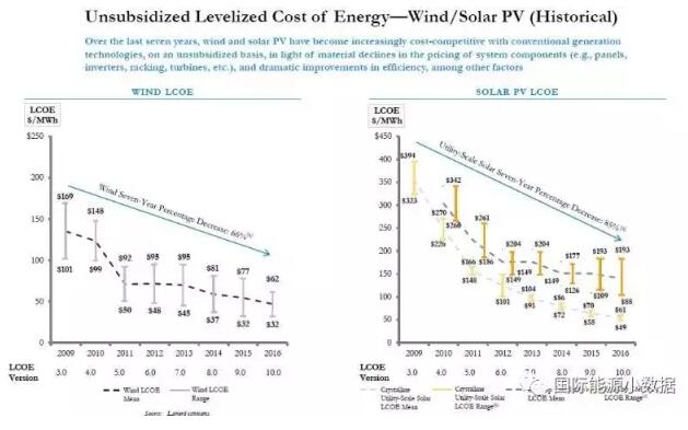 美國咨詢公司Lazard每年評估美國各類能源發電的全生命周期平準成本(LCOE),2016年12月15日公布了第10份報告。這份報告中的一幅圖表顯示了2009年以來美國風電、光伏成本的下降趨勢。
