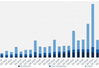 報告顯示,公共事業板塊中領先的是內華達州、北卡羅來納州和德克薩斯州。其中,德克薩斯州2017年第三季度光伏裝機量比2015全年所有太陽能裝機量還多。美國東南地區光伏市場剛剛起步,佛羅里達州、密西西比州、南卡羅來納州都實現強勁增長,且預期2017年光伏裝機量將高于此前多有年份。根據SEIA,當前全美處于建設當中的公共事業規模光伏項目有4GW,GTM Research預測到年末還將增加3.9 GW。這樣一來,2017年將成為美國光伏裝機量第二大的年份,僅次于2016年。